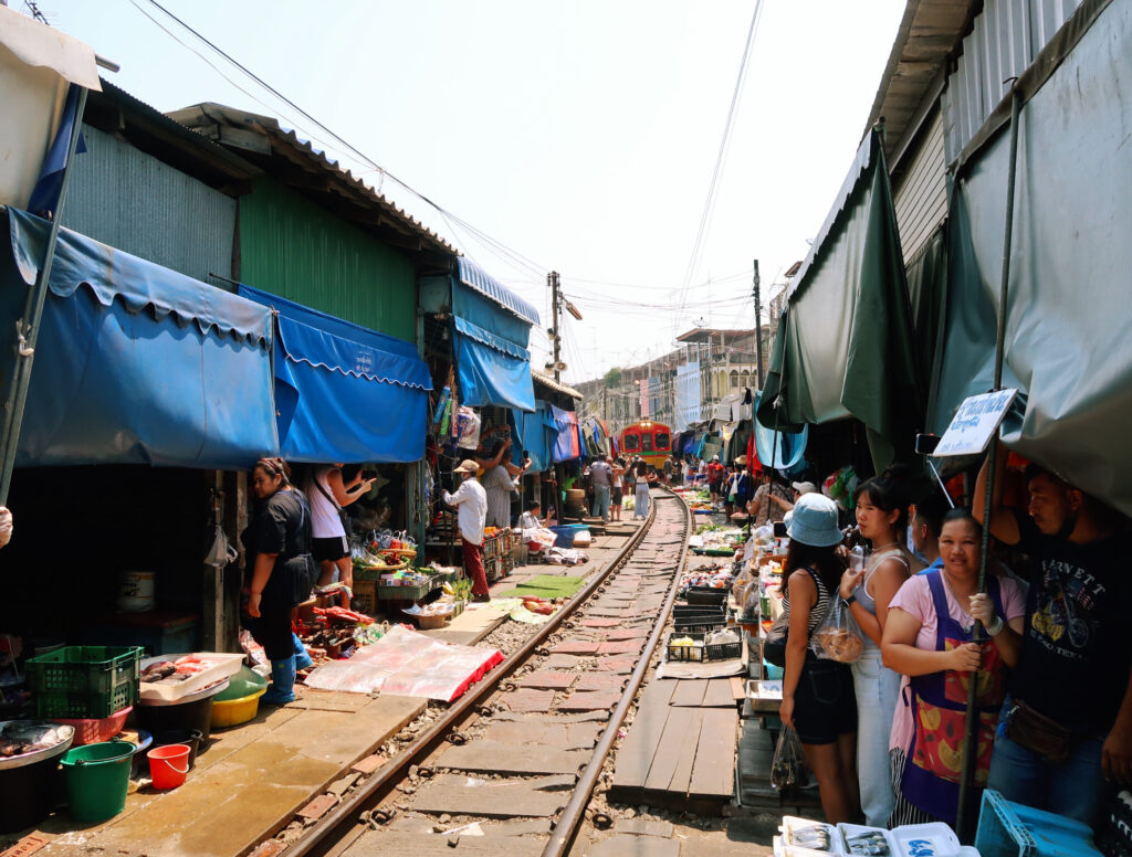 You’ll need to catch a songthaew from Amphawa Floating Market (which takes about 15 minutes) to reach the Maeklong Railway Market, but it’s well worth the trip and they come and go quite regularly.